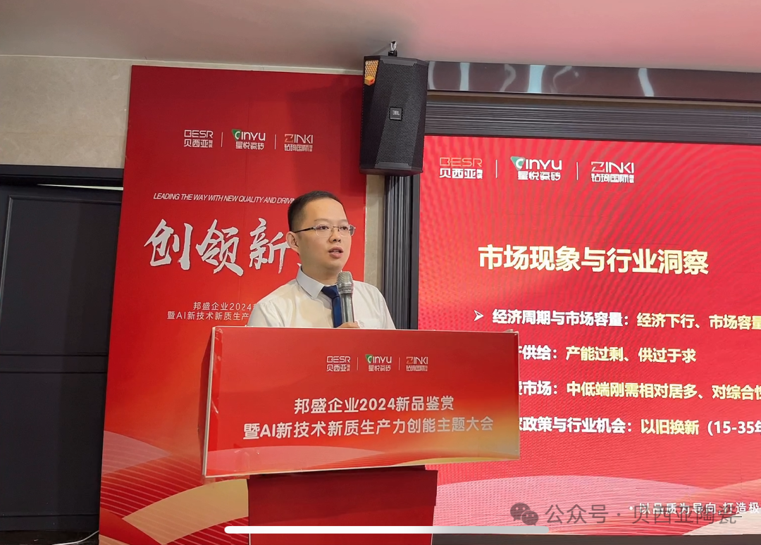 峰會上,眾成事業(yè)部常規(guī)品牌營銷中心總經理助理江軍以【瓷造者 · 向新而生】為主題,深度分析當前房地產市場的最新變化、市場的價格戰(zhàn)問題、行業(yè)現(xiàn)狀及發(fā)展態(tài)勢等市場問題,通過分析終端態(tài)勢、市場突圍路徑、AI 賦能以及新產品超白坯瓷磚、復刻釉瓷磚、超防滑瓷磚、天鵝絨瓷磚等新產品的推出,并AI 新技術為切入點,為品牌以及終端賦能新活力,為新周期下公司與經銷商伙伴的共創(chuàng)共享注入全新活力,為品牌高質量新發(fā)展創(chuàng)能蓄勢。
